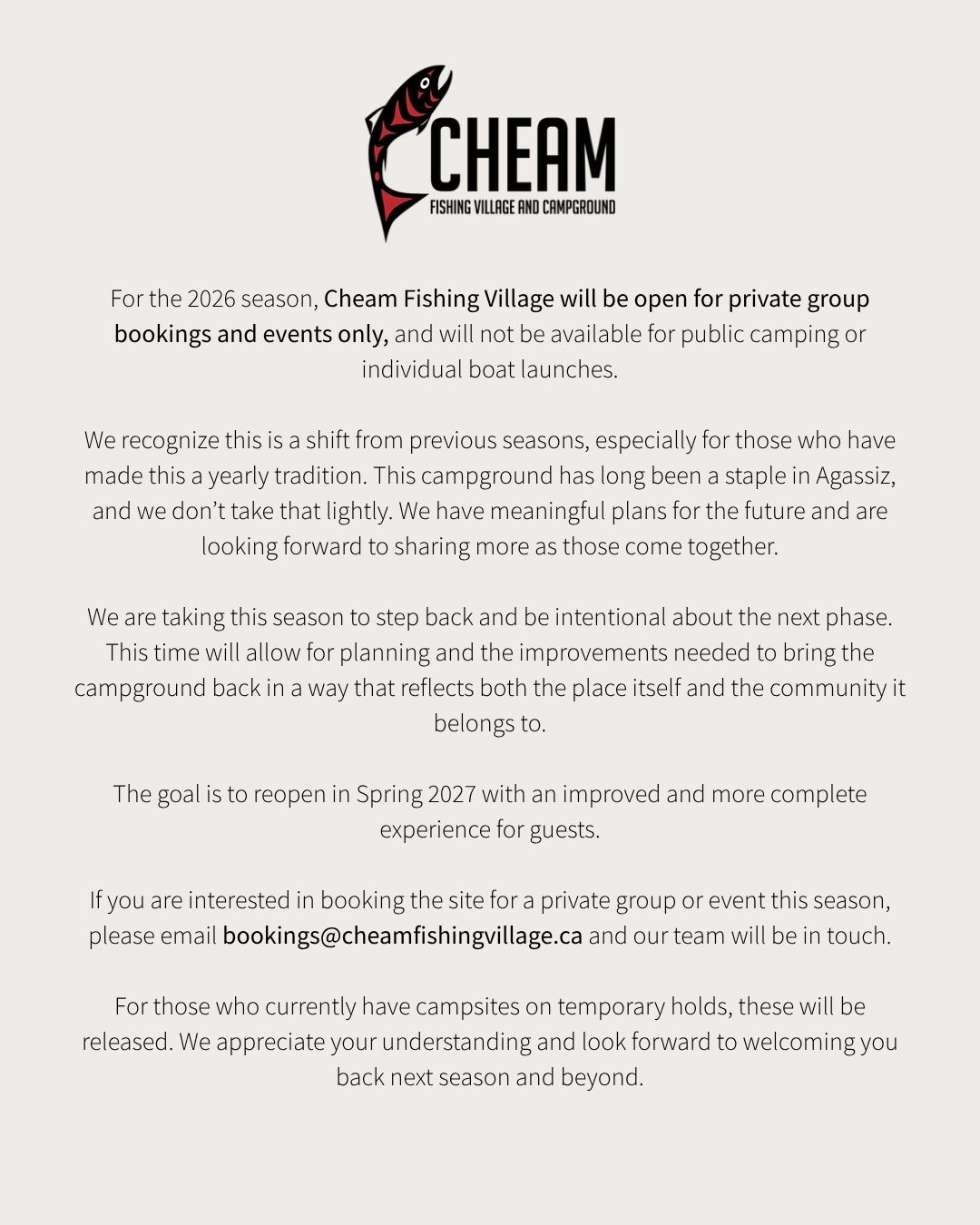 The Cheam Fishing Village and Campground is located on the bank of the majestic Fraser River. We are a seasonal campground that will in the early Spring, and close after the